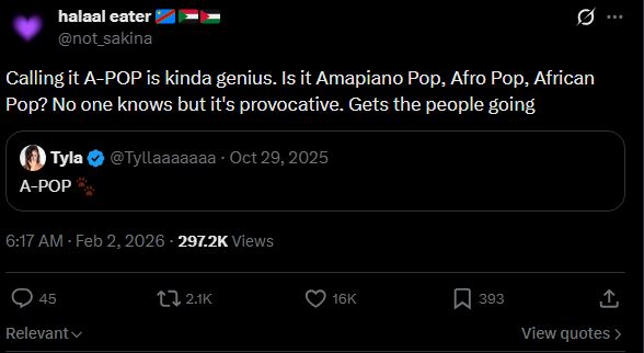 Tyla tagged the album ‘A-Pop’ making a fan to quiz the reason behind the title of the album.